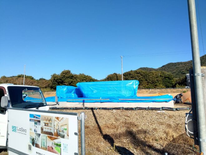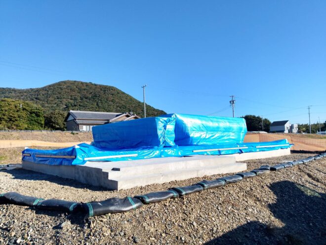 基礎工事が完了し、現場には上棟に向けて材料が置かれてます