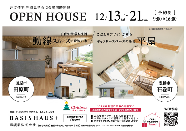 2会場同時開催で平屋建てと2階建ての完成見学イベントになります。