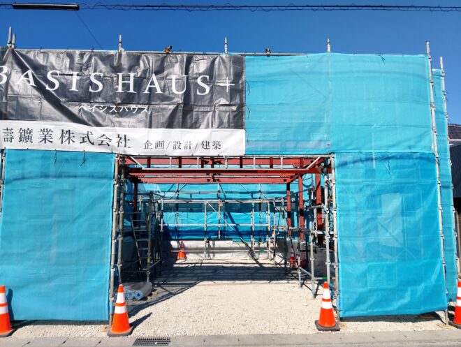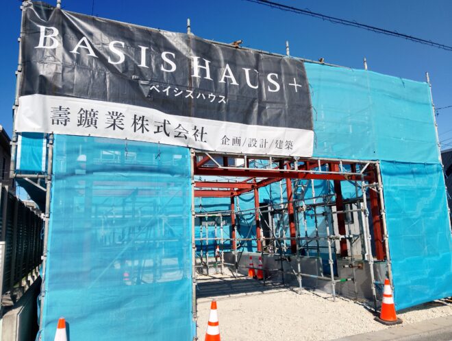 只今、鉄骨造新築ガレージ工事が進行中です。ベイシスハウスは注文住宅、分譲住宅以外にも総合建設業として多種多様な建築に対応できる会社です