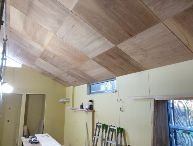 内部工事もこんな感じで「ラワン」仕上げでリビング天井のアクセントになっています。