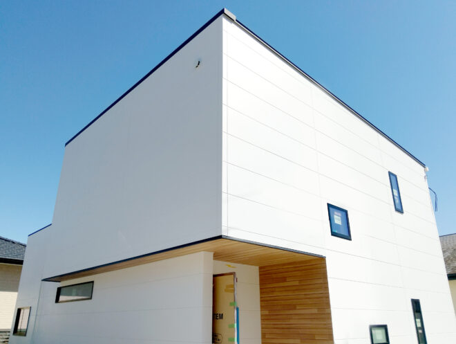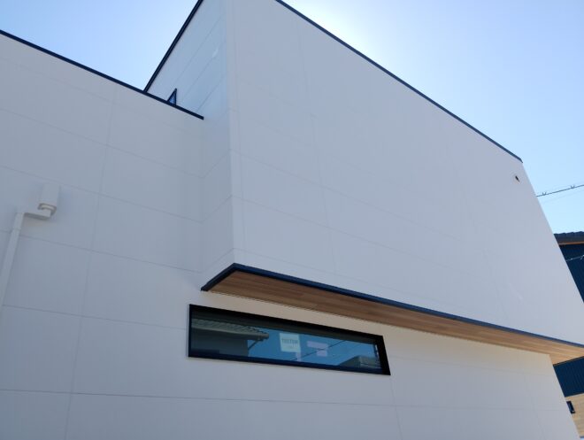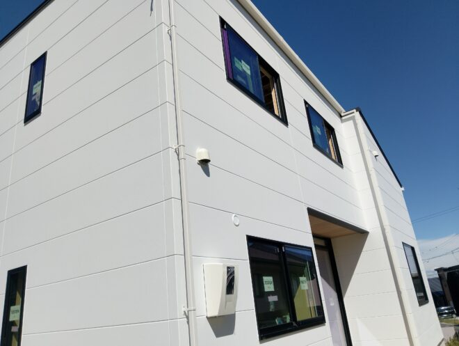 白い外壁がひときわ目を引く外観になっています。外壁はしっかりと表面コーティングされた仕様の外壁材ですので汚れの付着を抑え、色あせない外観を維持できます。