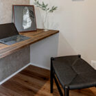 展示場とは違う、実際の暮らしを等身大で体感できる「まちかどモデル」。外観はガルバリウムのスマートさと職人の手仕事による塗り壁が調和するこだわりのデザイン。一歩中へ入ると、足元にはナラ無垢フロアが広がり、天然木ならではの心地よいぬくもりが家族を包み込みます。