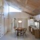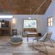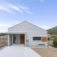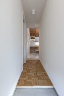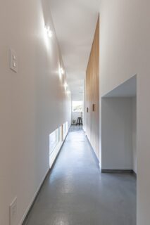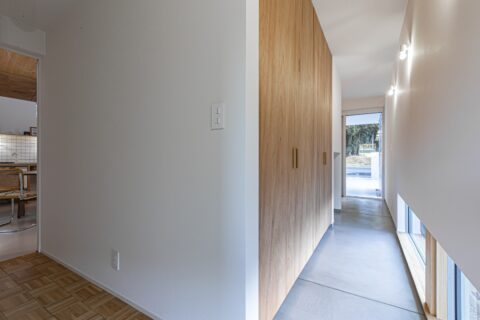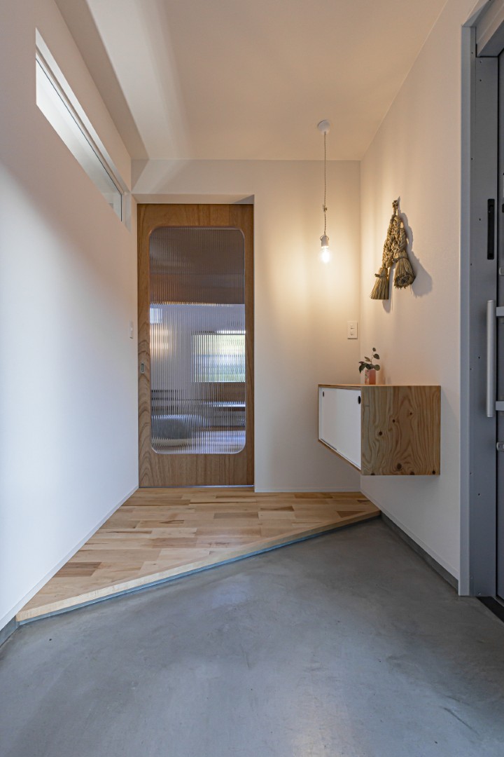 シンプルな切妻屋根にレッドシダーが映える、すっきりとし佇まいの平屋。 玄関の透明ガラス越しに、室内最奥のギャラリーが見通せる開放的な設計が特徴です。