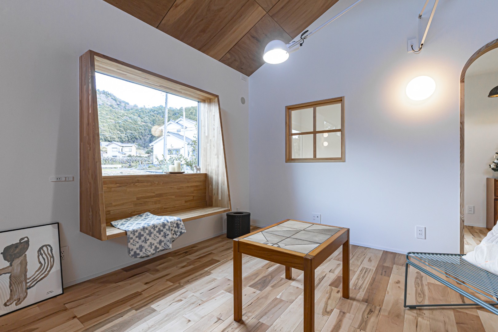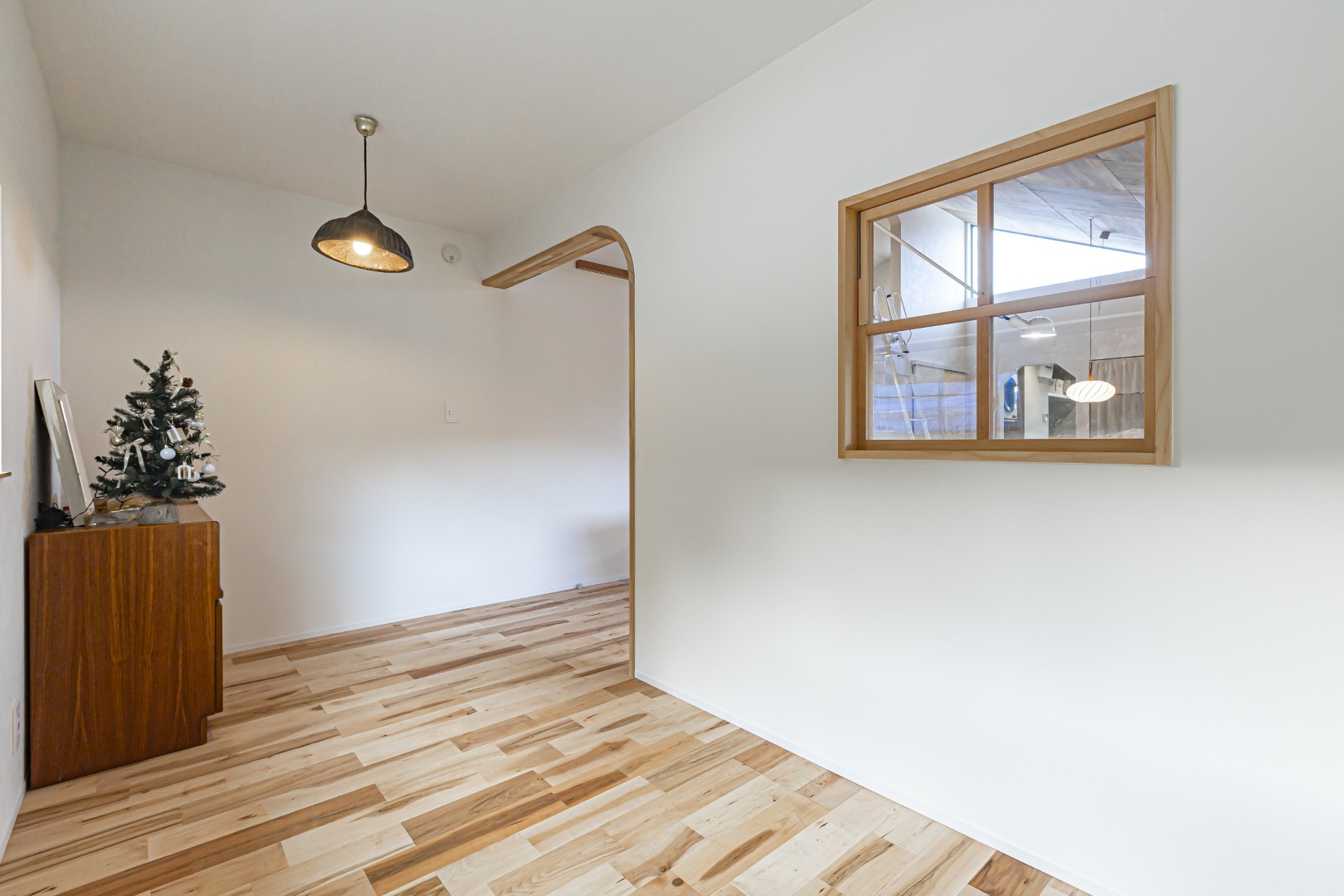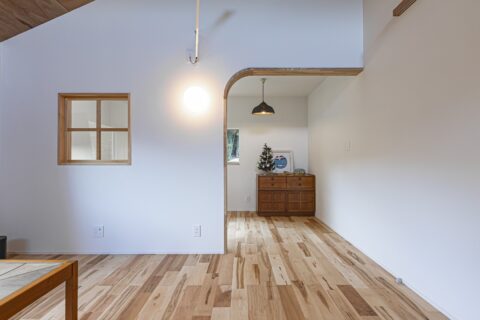 リビングの主役は、空間に柔らかな表情を生む「Rの間仕切壁」と、包み込まれるような安心感のある「ヌック」。お施主様好みの意匠を随所にちりばめ、機能性とデザインが共存する奥行きのある空間を叶えました。