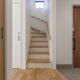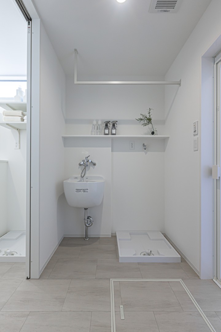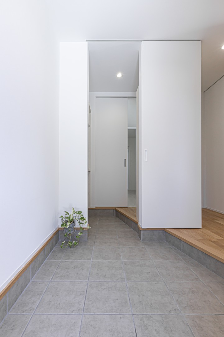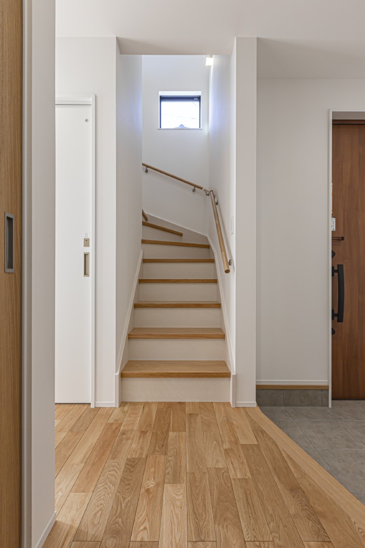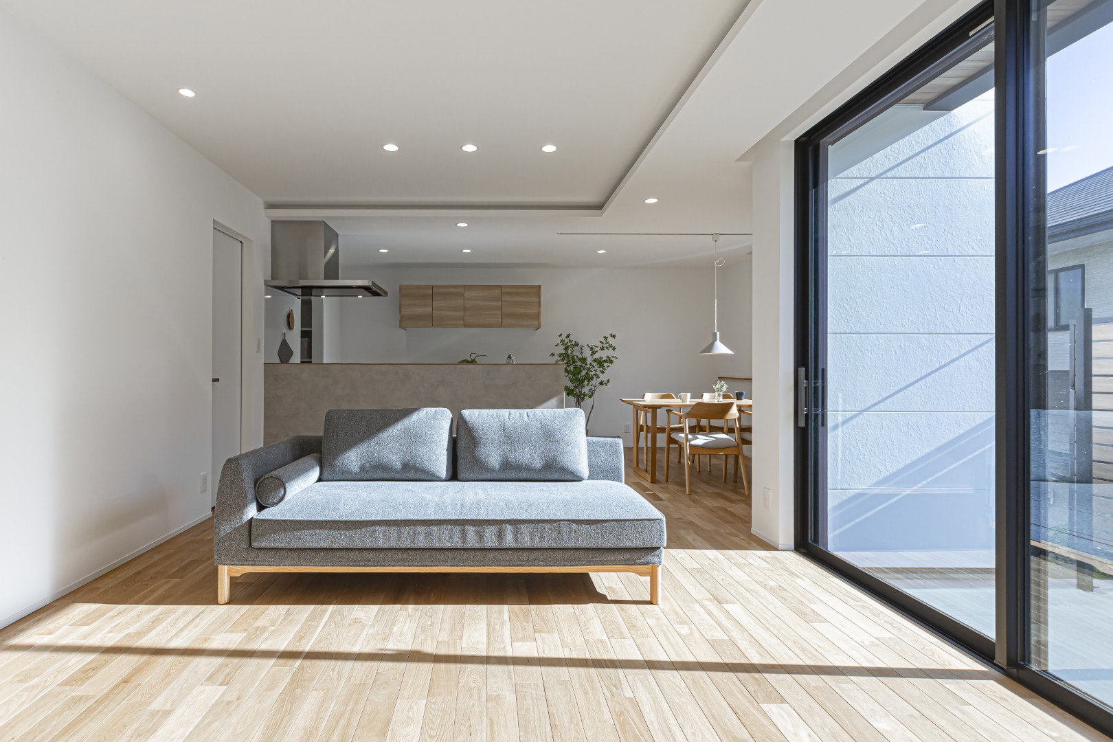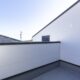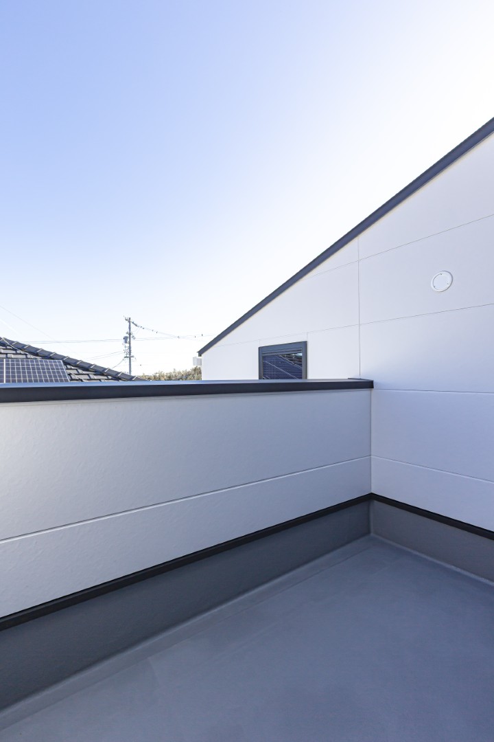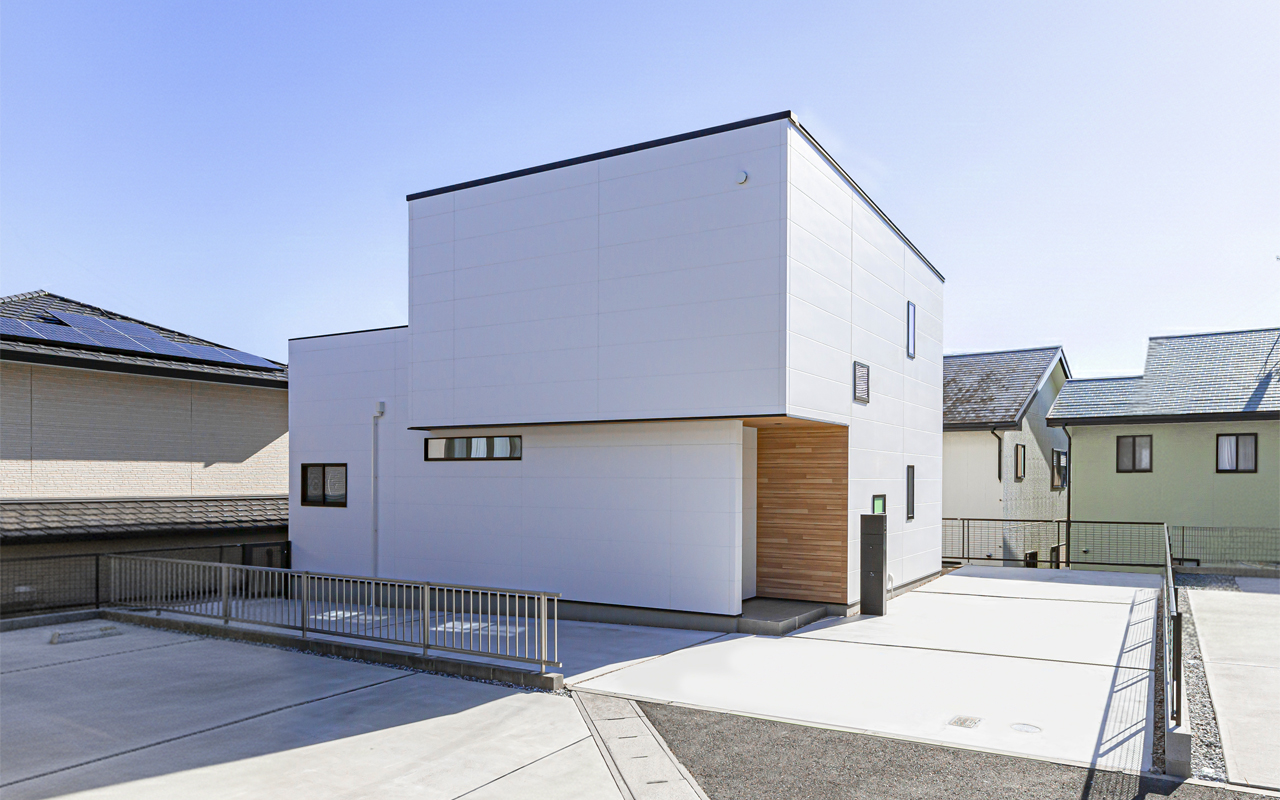 シンプルな白壁に黒サッシが映えるモダンな外観。玄関を入ると、斜め框が奥行きを演出する広いホールが広がります。リビングには上質な無垢ナラのフローリングを採用。フラットに繋がるテラスデッキはフェンス付きで、外からの視線を気にせず開放的な時間を過ごせます。