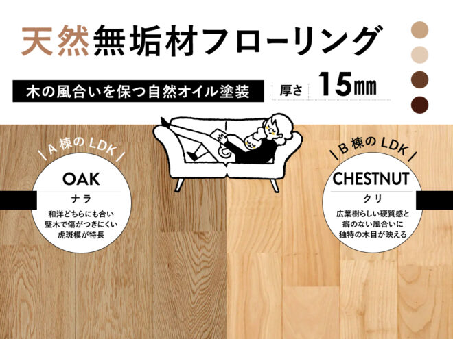 ・LDKには各棟異なる樹種の無垢フロアを採用!毎日ほっと落ち着く空間をつくります。